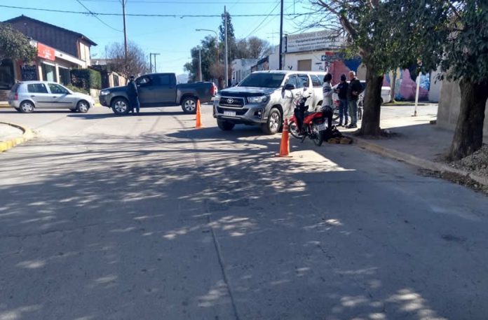 Una motocicleta marca Honda Wave 110 roja conducida por una mujer de 30 años la cual presenta traumatismo en tobillo izquierdo y en tanto el conductor del vehículo, un hombre de 71 años, (ambos conductores domiciliados en ésta ciudad), iba a bordo de una camioneta Toyota Hilux dr color gris, no presentó lesiones.