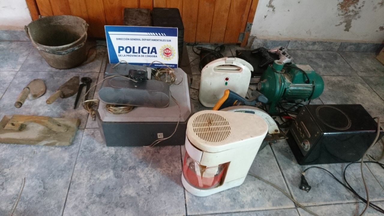 En el lugar, los uniformados incautaron efectos relacionados con hechos de robo: herramientas de albañilería, una cafetera blanca marca Yelmo, una sandwichera blanca Home, una bomba de agua verde Gema, una cortadora circular verde y naranja Marc Robust, una Play Station 3 con dos joysticks, un taladro negro Skil, un reproductor de DVD me Philips, un homenaje Theater Philips y un minicomponente negro Noblex.