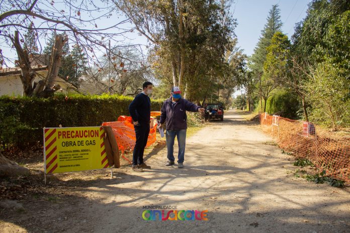 La primera red domiciliaria que tendrá nuestra localidad ya está en su etapa final. El Secretario de Gobierno, Matías Cuello, junto al Director de Obras Públicas, Daniel Azelar, y el Ingeniero a cargo de la obra estuvieron inspeccionando la reanudación y los avances de los 800 mts restantes de la obra de gas natural en barrio El Descanso.