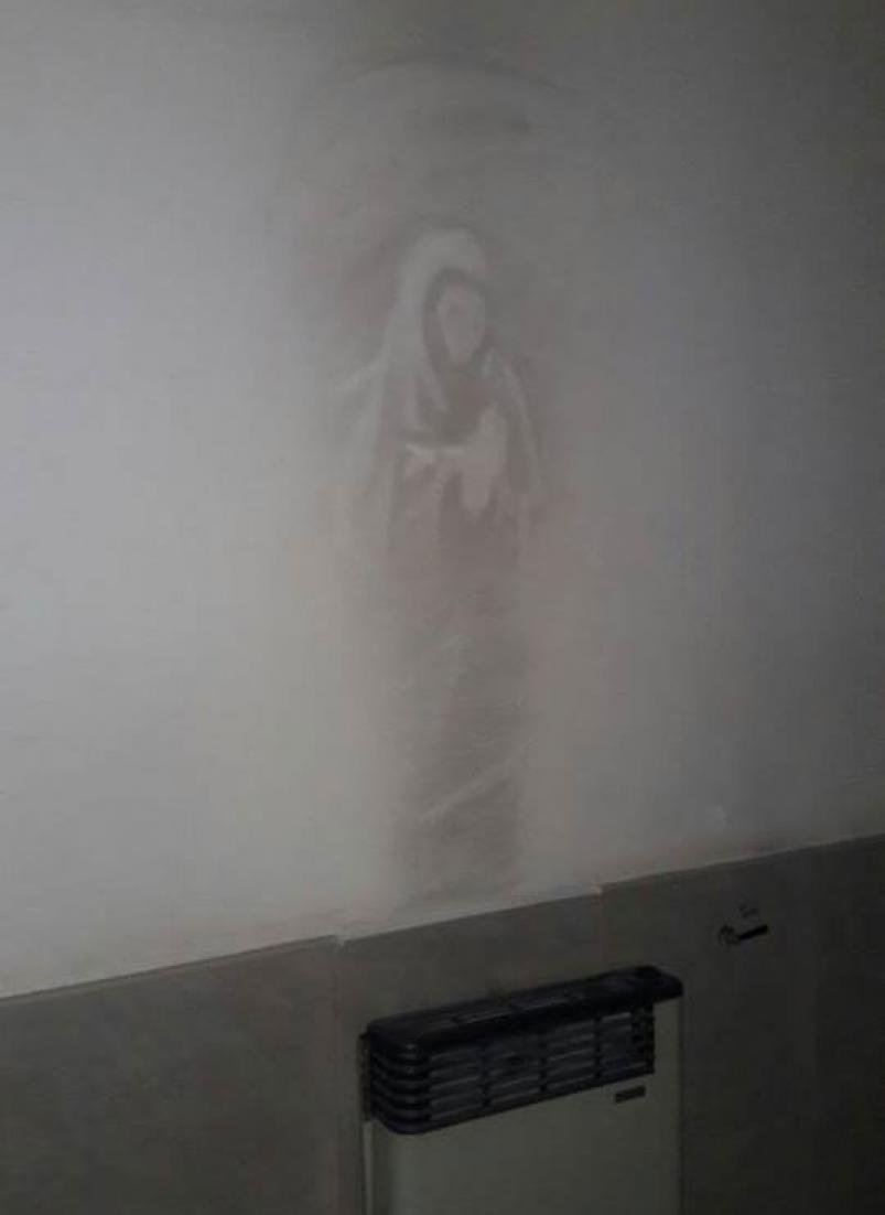 Una señora tenía un familiar muy grave y en la madrugada estaba rezando el pasillo cuando la imagen se comenzó a formar en la pared, encima de un calefactor.