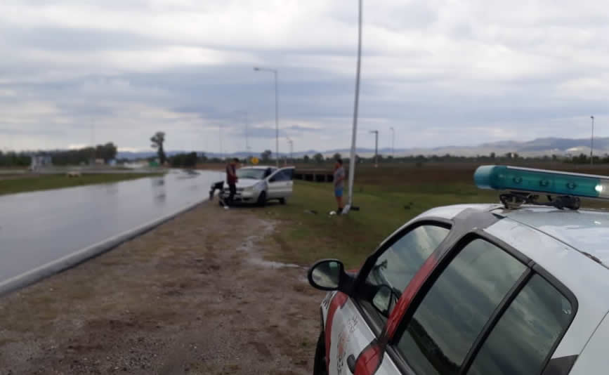Por razones que se intentan establecer pierden el control del rodado e impacta la parte derecha del Fiat Siena contra un poste lumínico. Ambos ocupantes fueron asistidos por el móvil de emergencias a cargo de un facultativo trasladando a uno de los los hombres al Hospital Regional diagnosticando traumatismo de hombro derecho e hipertensión.
