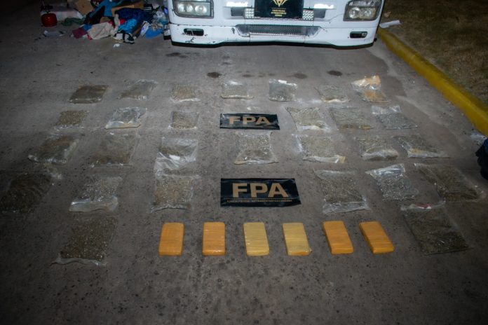 Participaron de Policía de la Provincia y la división K9 de la Fuerza Policial Antinarcotráfico. Se hallaron 125 dosis de marihuana, varias dosis de cocaína, dinero en efectivo ($400.100) un revolver calibre 32 y 6 cartuchos, además de elementos que se encuentran en infracción a la Ley Nacional 23.737.