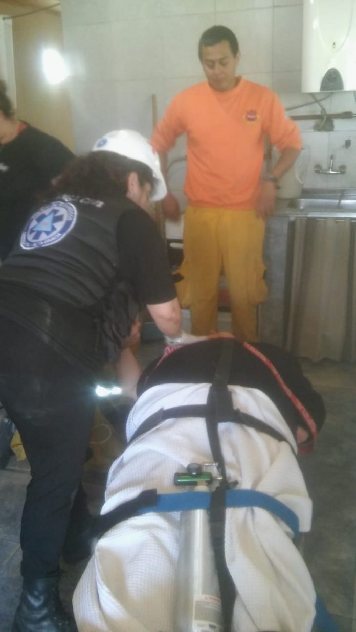 La damnificada, de 55 años, presentaba traumatismo en su miembro inferior derecho con posible rotación de rodilla, tras haber sufrido una caída en su baño. Se procedió a tomar sus signos vitales y se inmovilizó la extremidad. Debido a la contextura física de la paciente, Defensa Civil debió acudir al Cuerpo de Bomberos Voluntarios para poder extraerla del espacio confinado en el que se encontraba y luego fue trasladada al Hospital Regional Arturo Illia.