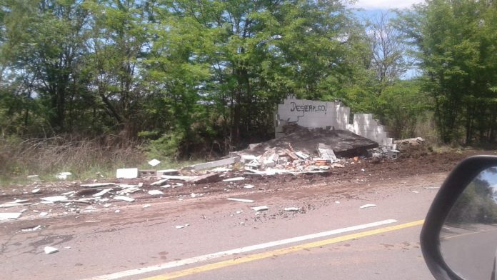 El conductor de un Mercedes Benz Naranja, que se encontraba realizando una mudanza, perdió el control del mismo ya que la banquina se encontraba inestable y embistió una garita de colectivo, destrozándola.