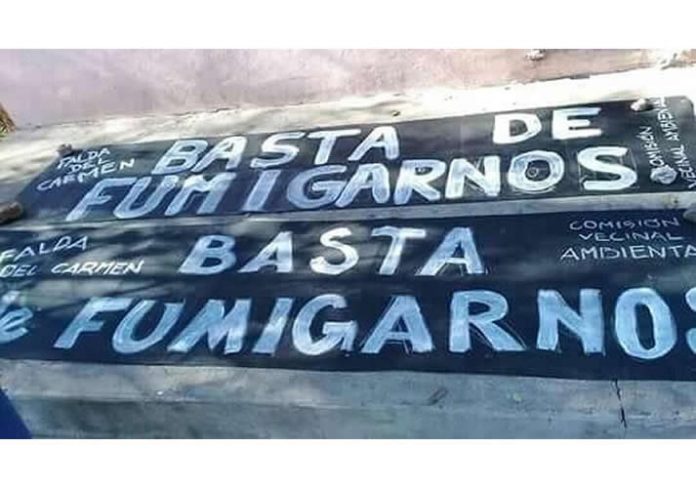 «El casco urbano de Falda del Carmen / Valle Alegre / Los Talas y Falda del Caňete ubicados a orillas de la ruta provincial C-45 norte del departamento Santa Marií se encuentra RODEADO de campos sembrados. En muchos casos las fumigaciones se ejercen a menos de 10 metros de las viviendas y escuelas del pueblo. Los chacareros, sin importarle si hay viento o si cumplimentan la ley provincial n°9164, envenenan igual a toda la comunidad con total impunidad y apoyo del Presidente comunal Omar Roberto del Bell de Unión Por Córdoba.