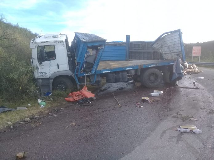 Según relató el conductor, el vehículo se quedó sin frenos, por que los ocupantes se arrojaron del camión a la ruta, impactando el mismo contra la montaña, quedando el acoplado sobre uno de sus laterales, obstruyendo parcialmente la ruta.