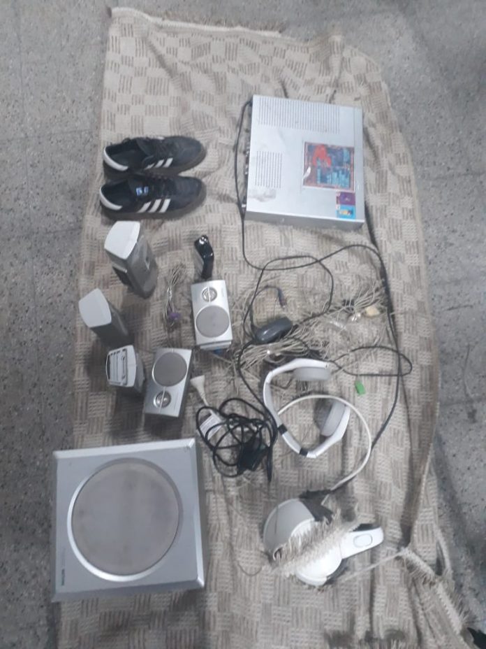 Informa personal de la patrulla urbana que mientras patrullaban por la calles mencionadas, observaron cerca de un descampado un bulto. Al acercarse, se percataron de que se trataba de una colcha de color marrón claro, la cual envolvía un Home Teatre Phillips compuesto por seis parlantes, un par de zapatillas Adidas negras con tiras blancas, un DVD Phillips, una pava eléctrica marca DRIX blanca y negra, unos auriculares blancos Motorola, una máquina de afeitar gris sin marca visible, un recipiente negro con la marca Asepxia y una manojo de cables que serían de los parlantes.
