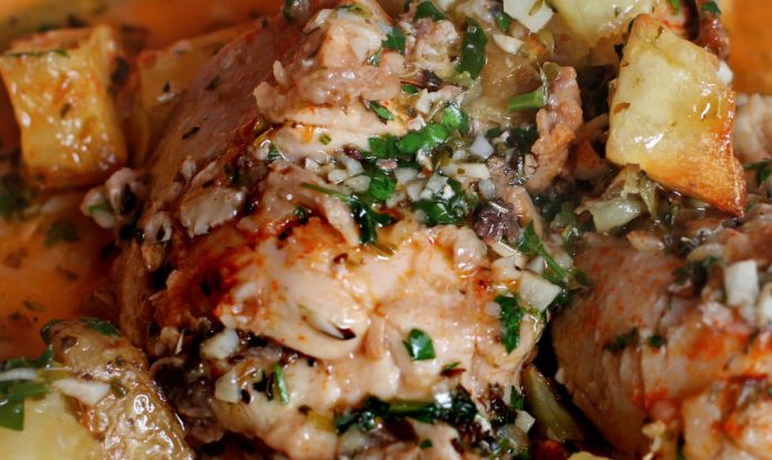 Consiste en un guiso de pollo acompañado con muy pocos y nobles ingredientes, como el vino blanco, abundante ajo y perejil, orégano, además de limón y  aceite de oliva extra virgen. Un plato que ya no se ve en los restaurantes de moda, pero que si se conserva intacto en el menú de nuestros bodegones y en el seno de nuestros hogares. Fuera de programa, esta vez terminaré el plato con un excelente pimentón ahumado español de la región de la Vera. El agregado no es muy ortodoxo pero queda riquísimo.