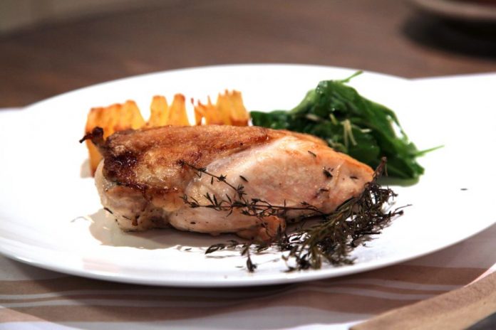 Conservar las pechugas de pollo con piel y salar. En una sartén con aceite de oliva y mantequilla, sellar las pechugas de pollo -primero del lado de la piel-. Antes de dar vuelta las pechugas, agregar a la sartén echalotes cortados rústicamente, romero, tomillo y el limón en mitades. Al dar vuelta las pechugas, añadir vino blanco. Luego llevarlas al horno y cocinar a 180 C hasta terminar la cocción.