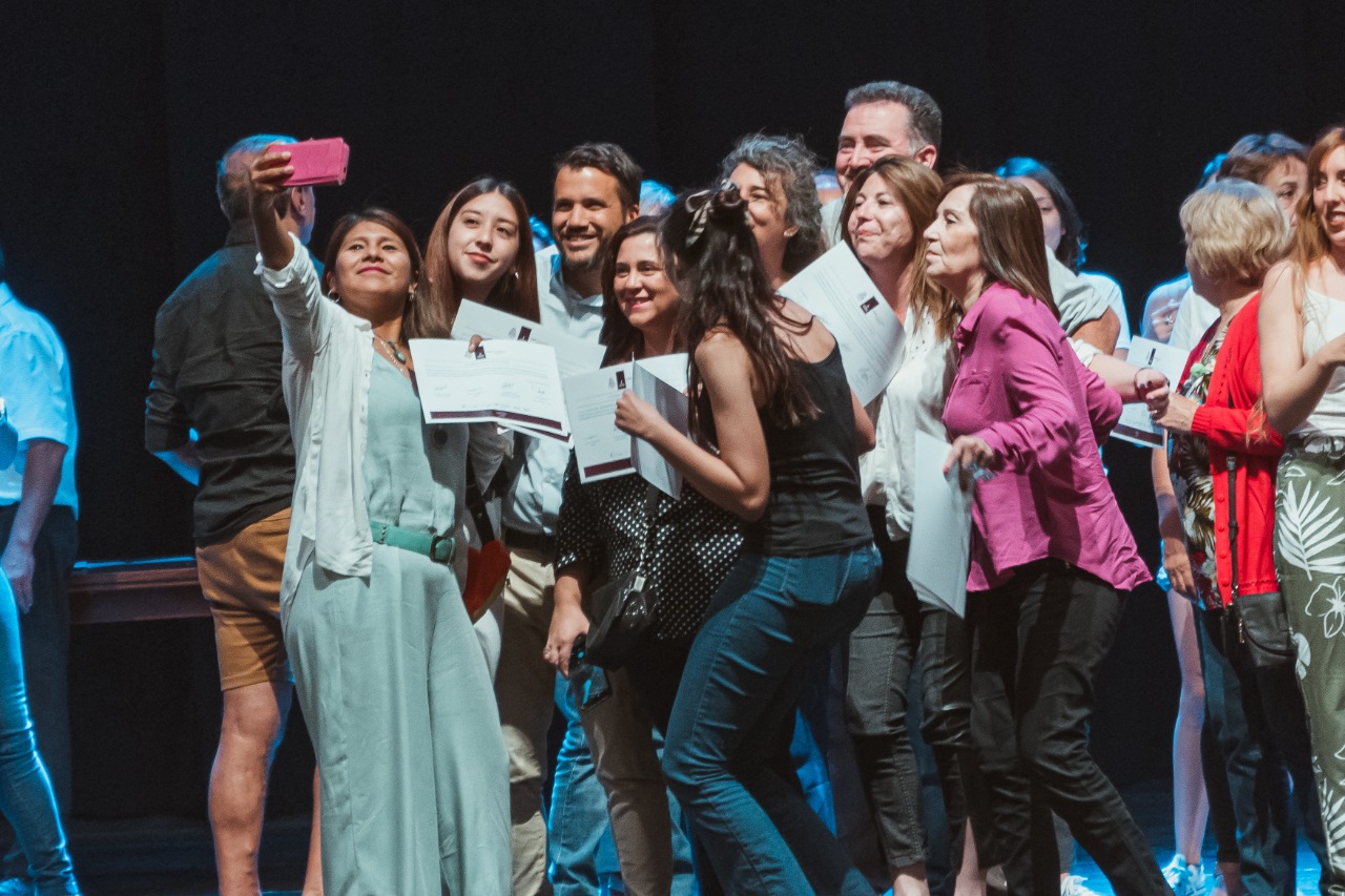 El Intendente Marcos Torres, la Viceintendenta Cristina Roca, concejales, el Secretario de Gestión Pública Pablo Soler, el Director de Educación Rodrigo Martínez y el coordinador del Programa Universidades Populares de la UNC Guillermo Luque, hicieron entrega de sus diplomas a 750 vecinos y vecinas que se capacitaron en 95 cursos y talleres municipales durante este año.