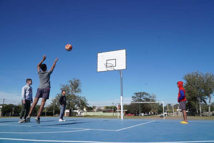 En primer término se llevó a cabo los trabajos de movimiento de suelo, nivelación y compactado de base. Encofrado y hormigonado, alisado y trabajos de pintura correspondiente y la colocación de los aros de básquet.