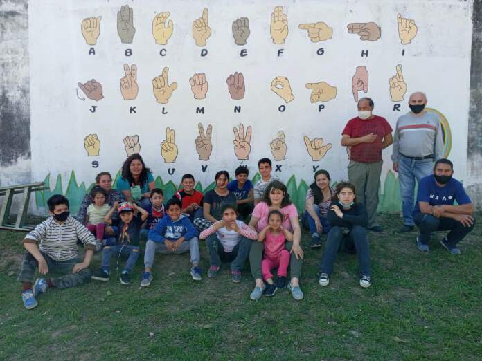 Jóvenes de «Callejeando» y de los barrios General Bustos y San Martín dedicaron el sábado a pintar un mural con el Alfabeto Dactilológico Argentino; es decir, con letras de los alfabetos de las lenguas orales-escritas por medio de las manos.