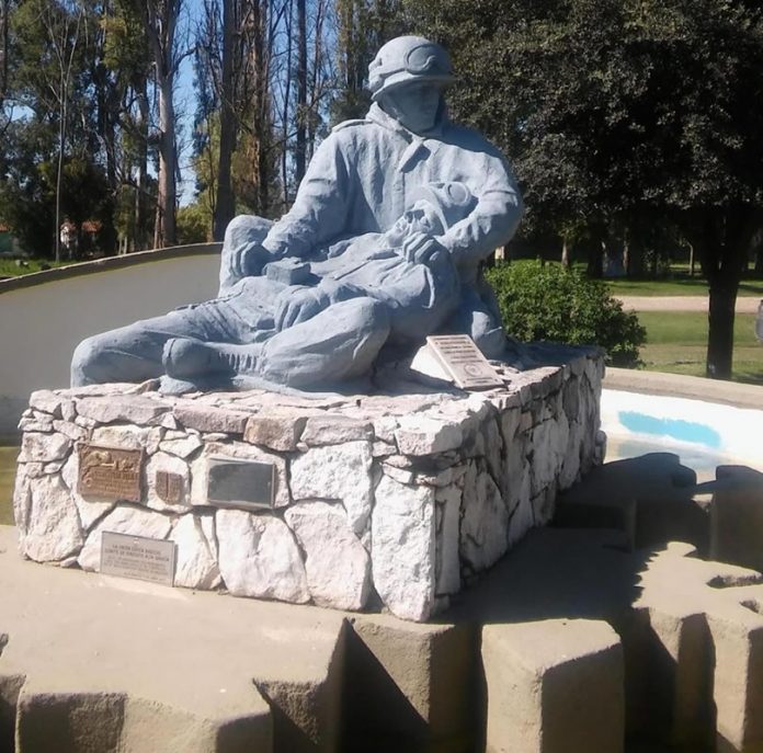 _ Durante la guerra, un cabo murió prácticamente en mis brazos (Cabo Juan Waudrik de Río Cuarto). Cuando vuelvo de Malvinas, me prestan un libro sobre Malvinas y veo una imagen igual a lo que había vivido o casi en la misma posición, en una foto del cronista de guerra Eduardo Rotondo. Entonces me hice una escultura chiquita de arcilla. Al tiempo, los veteranos querían otra escultura y les presenté como propuesta ésta y les gustó.