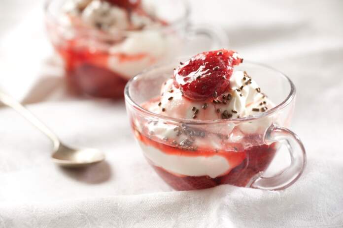En una copa colocar un poco de las frutillas, luego dos cucharadas del helado y cubrir con un poco más de las frutillas. Decorar con granas de chocolate.