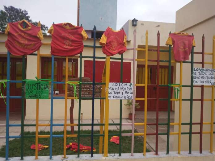 Una impactante intervención se realizó en el jardín de Santa Ana, sitio investigado por posibles abusos a pequeños que asisten al lugar, madres y padres colgaron parte del uniforme junto con carteles que pedían justicia. «Qué triste ver esas remeritas que como mamás compramos contentas con la ilusión de marcar un lindo camino para nuestros hijos y que todo haya sido un horror», dice un mensajito de una de las mamás afectadas.