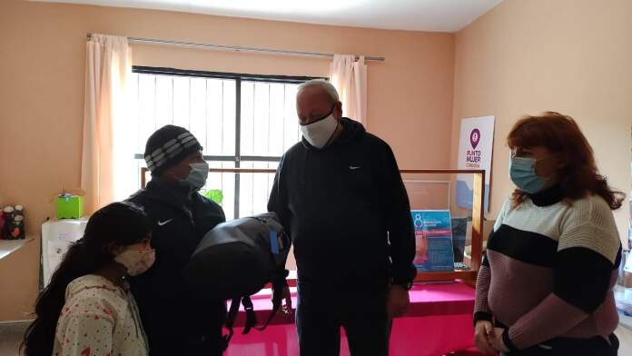 En la foto, el intendente José Luis Becker, junto a la titular de la Casa de la Mujer, Carolina Lacagnina haciendo entrega de uno de los ajuares a un futuro papá de nuestra localidad.