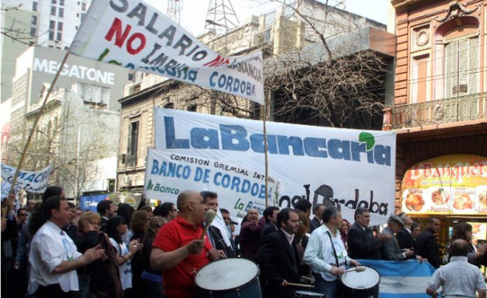 La delegación cordobesa de La Bancaria se manifiesta este martes por el centro de la Ciudad de Córdoba como parte del plan de lucha que lleva adelante el gremio contra el ofrecimiento de incremento salarial del 9 por ciento.