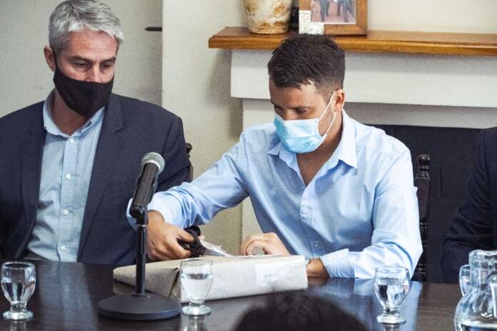 El Intendente Municipal Marcos Torres, junto al Secretario de Recursos Hídricos de Ministerio de Servicios Públicos de la Provincia Edgar Castello, el Vicepresidente de la Administración Provincial de Recursos Hídricos Guillermo Vilchez, el Secretario de Obras Públicas y Planificación Marcos Moreira y el Secretario de Economía y Finanzas Carlos Di Leo procedieron a la apertura de los sobres de Presentación de Licitación Pública Nacional Nº 01/2021: “Desagüe pluvial sector norte calle Lucio V. Rossi.