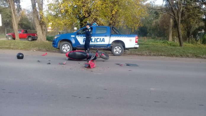 Por razones que se intentan establecer, motocicleta marca Brava Nevada, de 110 Ccc, conducida por una mujer de 46 años de edad, domiciliada en barrio Parque Carrasco, de la localidad de Anisacate, chocó contra el auto y sufrió traumatismo de cadera, por lo que debió ser trasladada al Hospital Illia.