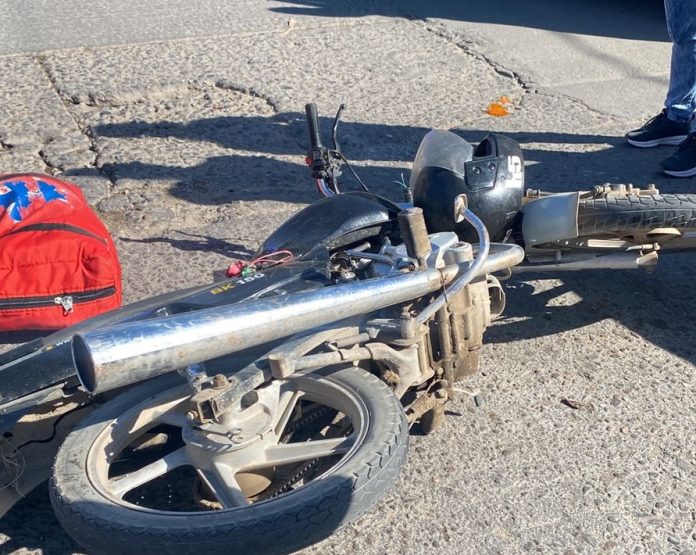 El accidente se registró en horas del mediodía de este jueves en la intersección de Agustín Aguirre y Roberto Saieg cuando un vehículo embistió a una moto. Producto del impacto los ocupantes del vehículo menor fueron derivados al hospital por distintos traumatismos.