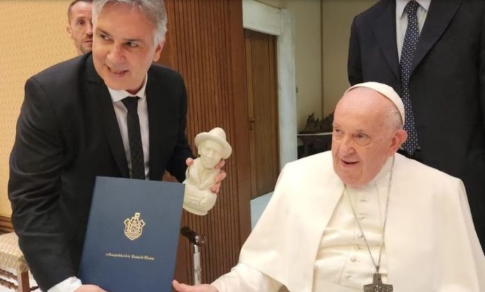 Durante el encuentro con el Sumo Pontífice, las autoridades le obsequiaron una imagen del Cura Brochero, obra del altagraciense Julio Incardona.